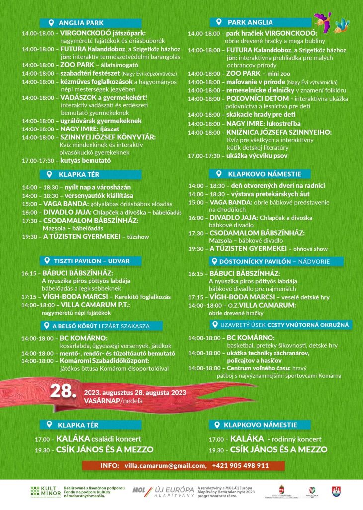 A Villa Camarum Polgári Társulás immáron nyolcadik alkalommal szervezi meg a Komálom Gyerkőcfesztivált, melyre sok szeretettel várnak minden kedves pici, kicsi és nagy érdeklődőt. A rendezvény hű szeretne maradni a gyökereihez és ahhoz a hitvallásához, amit a kezdetektől fogva a magáénak vall. “A célunk az, hogy a hagyományos értékrend elve mentén szórakoztassunk – élő zenés programokkal, bábjátékokkal, népi fajátékokkal készülünk.”